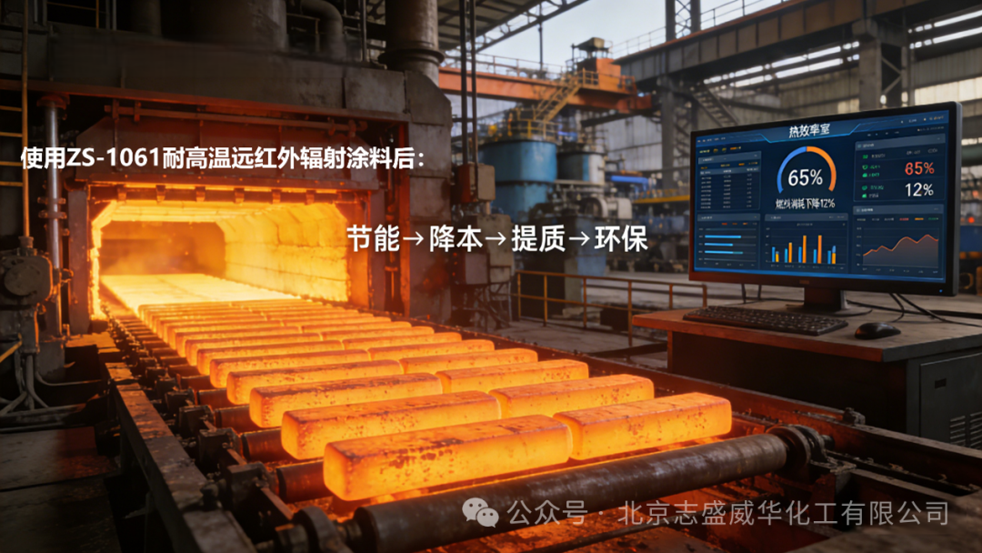 针对步进加热炉的效率痛点,北京志盛威华化工有限公司研发的ZS-1061钢厂加热炉耐高温远红外辐射涂料,依托远红外辐射传热技术,从根源上优化了炉内热交换工况。其核心工作原理在于,涂料中含有过渡族元素氧化物、氧化锆、稀土氧化物Y₂O₃等特殊填料,这些成分在800℃以上的高温环境下(此时加热炉热传递以辐射为主,占比超90%),能高效吸收炉膛内的热能,并将其转化为波长集中在0.76-20μm区间的远红外辐射能发射出去。
